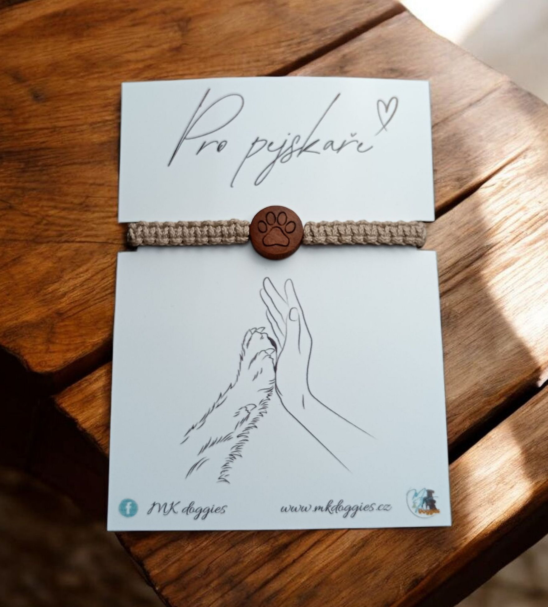 Stylový, ručně pletený náramek s dřevěným korálkem, do kterého jsme precizně vygravírovali motiv psí tlapky. Tento jedinečný šperk je dokonalým doplňkem pro všechny milovníky psů.