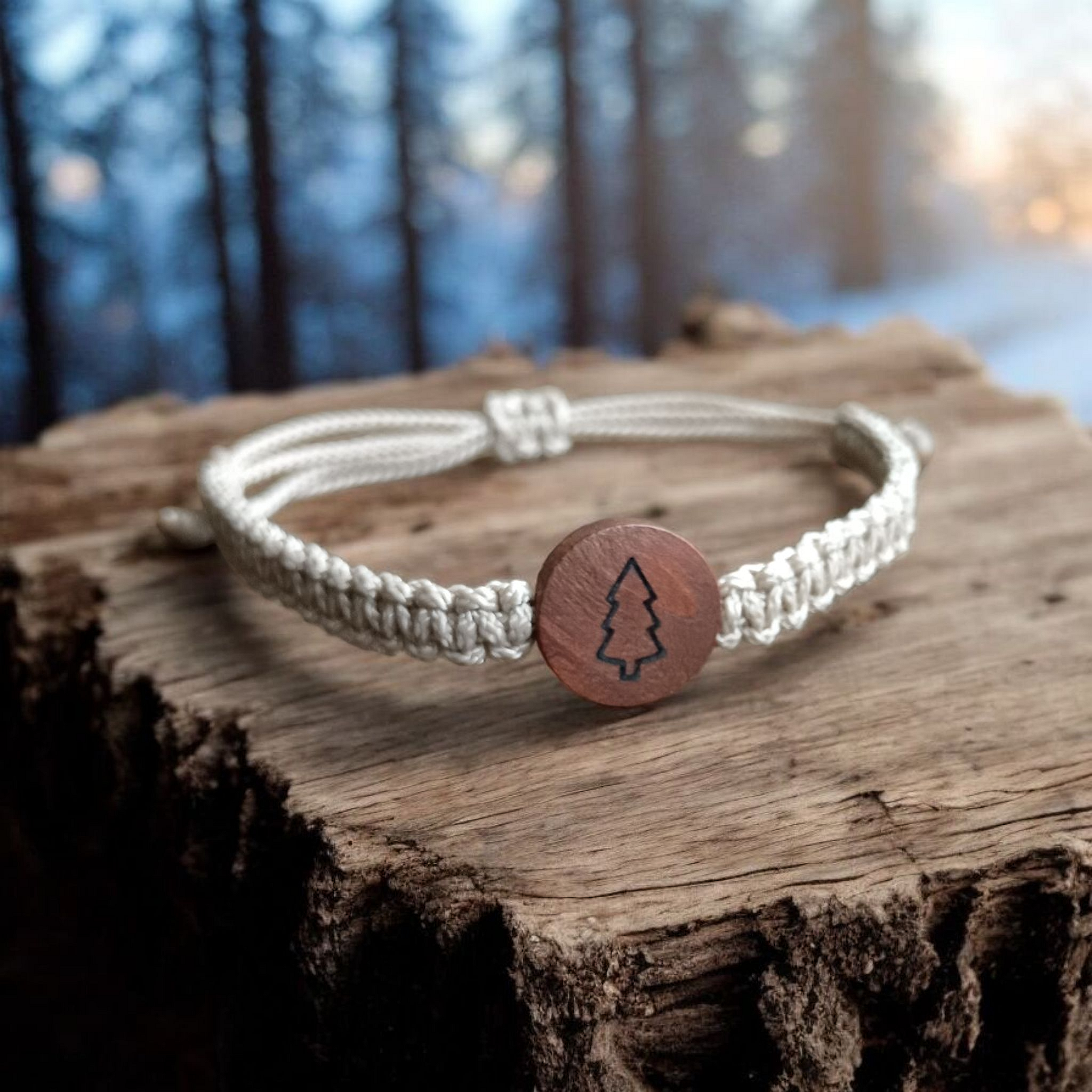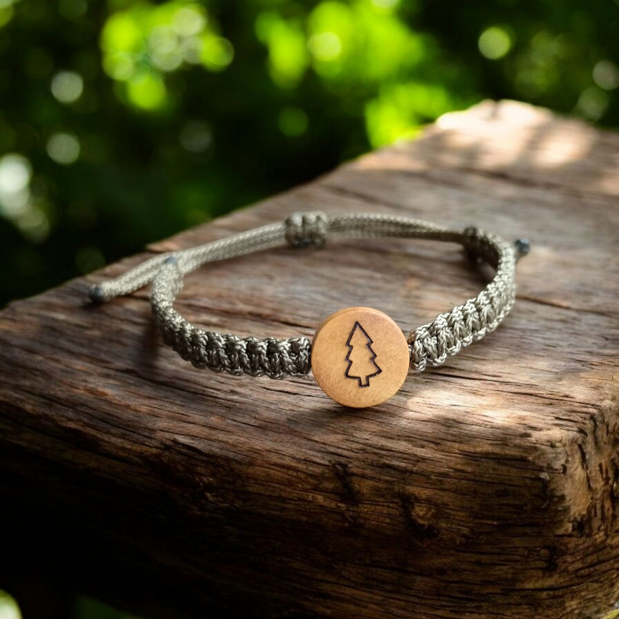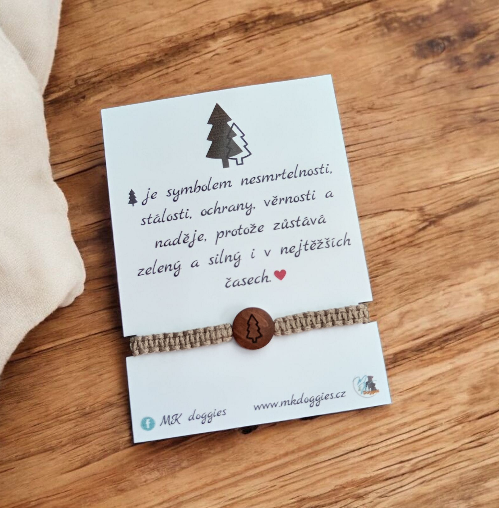 Stylový, ručně pletený náramek s dřevěným korálkem, do kterého jsme precizně vygravírovali motiv jehličnatého stromu. Je symbolem nesmrtelnosti, stálosti, ochrany, věrnosti a naděje, protože zůstává zelený a silný i v nejtěžších časech.