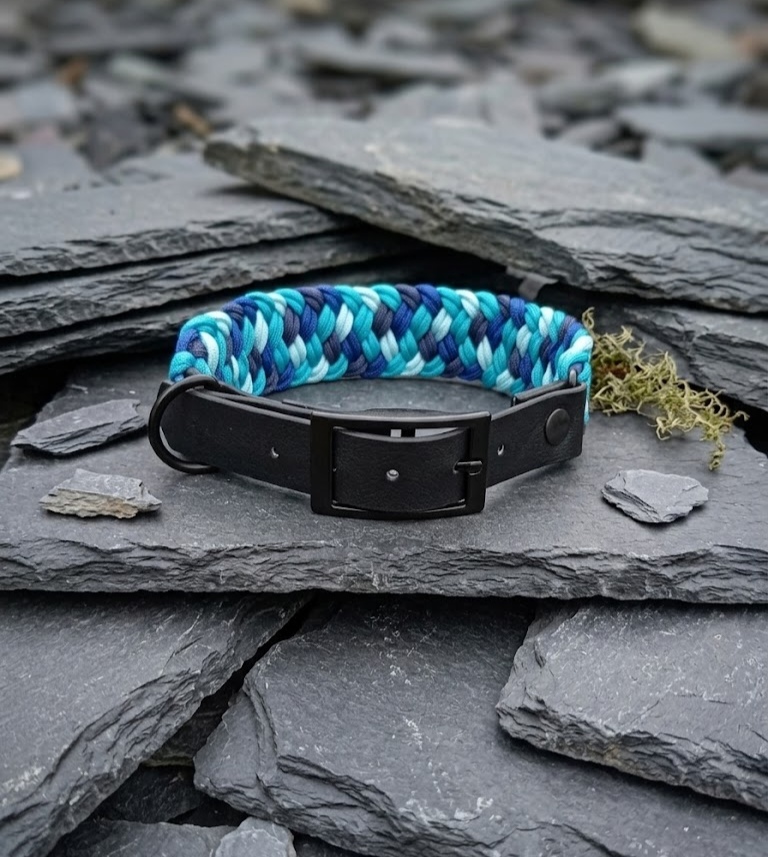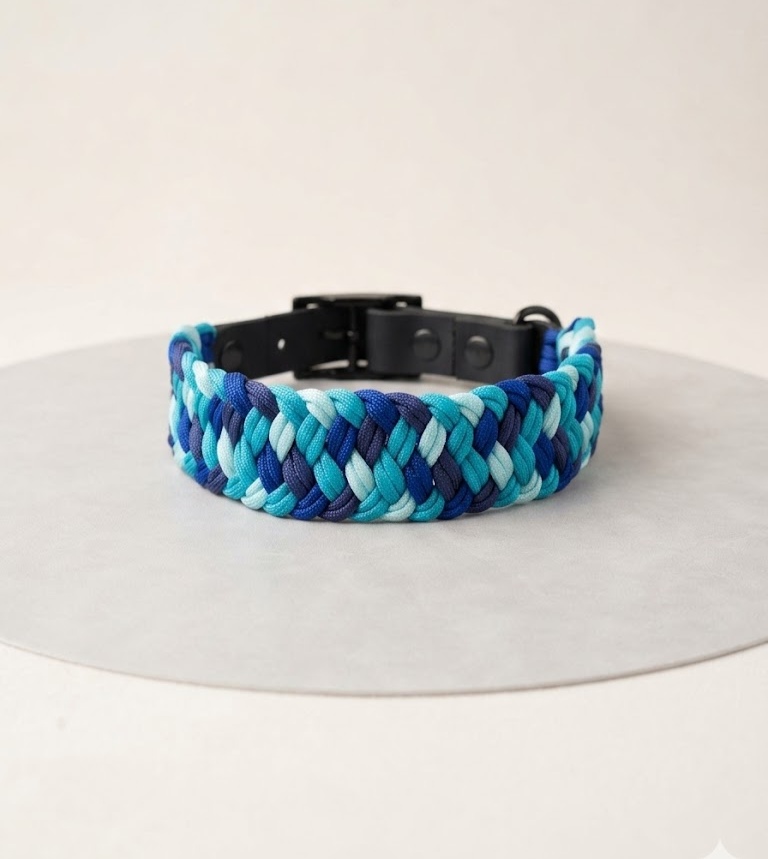 Pletený obojek pro střední plemena, nastavitelný v rozmezí 42–50 cm, spojuje pevnost Paracordu, pohodlí PVC popruhu a kouzlo poctivé ruční práce.