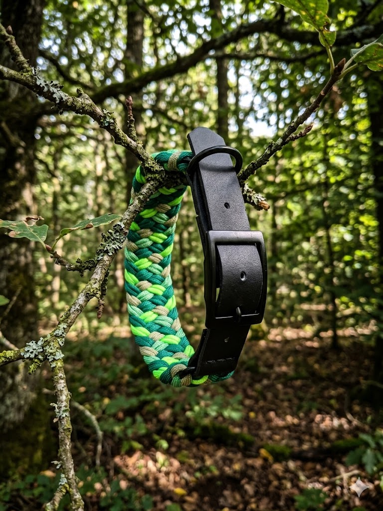 Pletený obojek pro střední plemena, nastavitelný v rozmezí 42–50 cm, spojuje pevnost Paracordu, pohodlí PVC popruhu a kouzlo poctivé ruční práce.