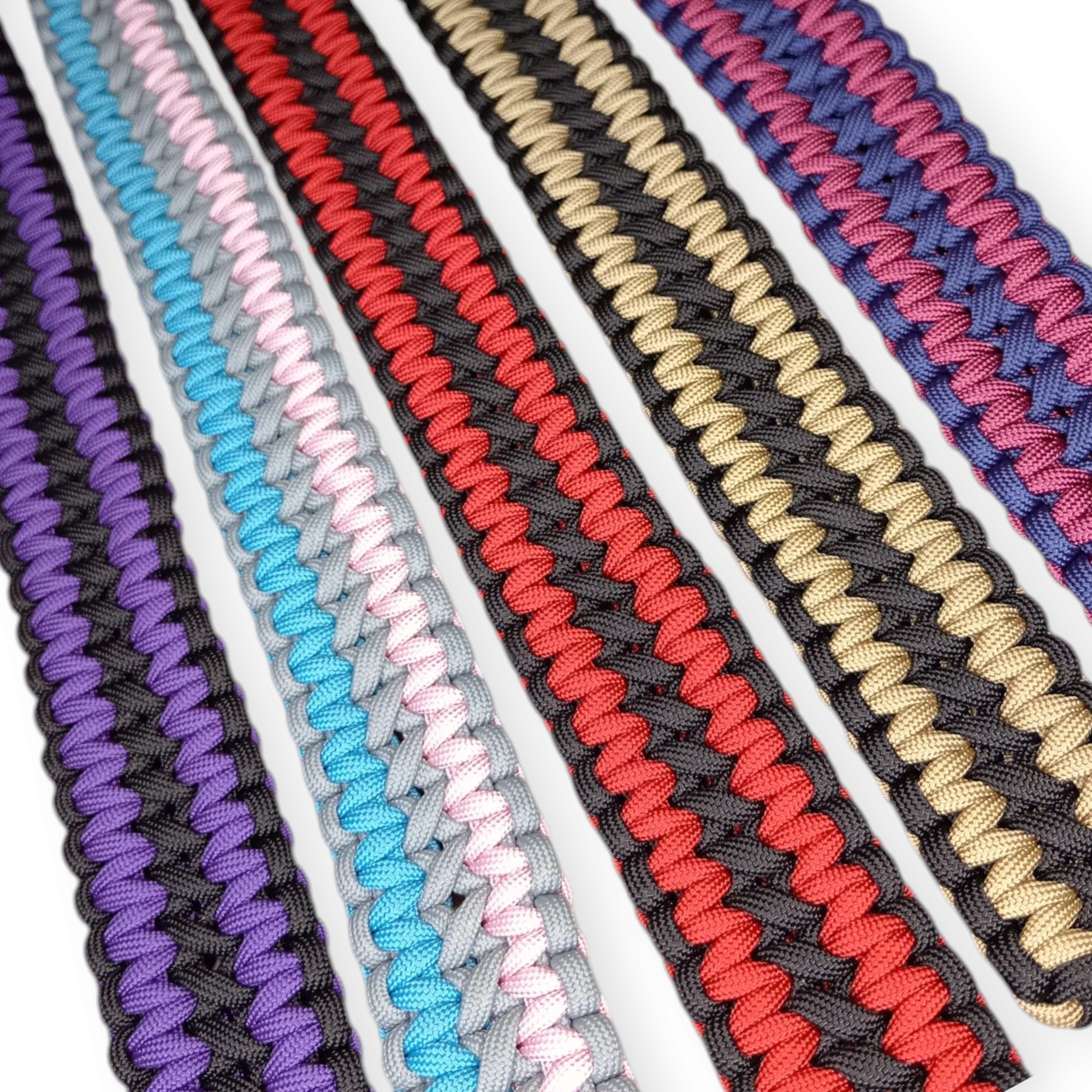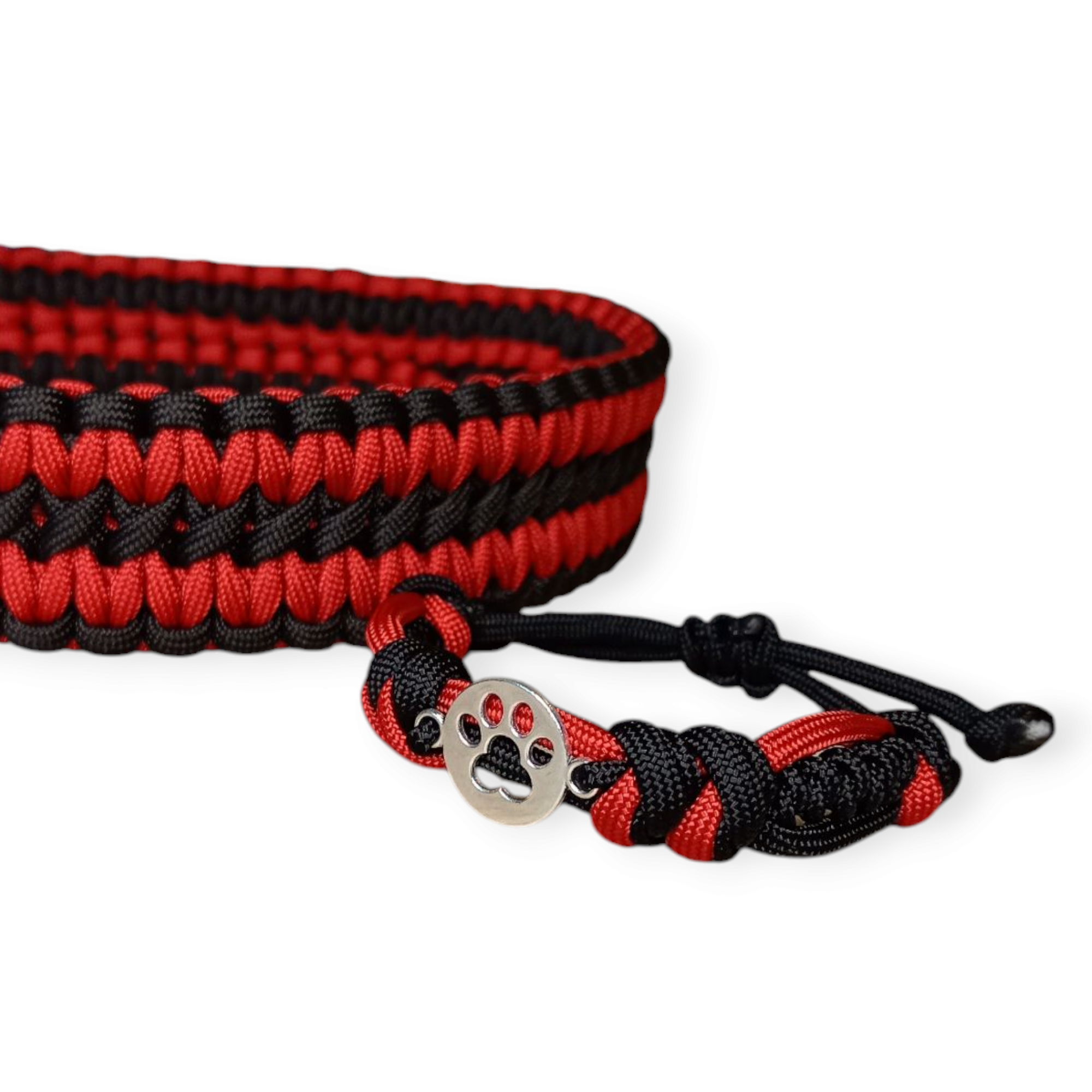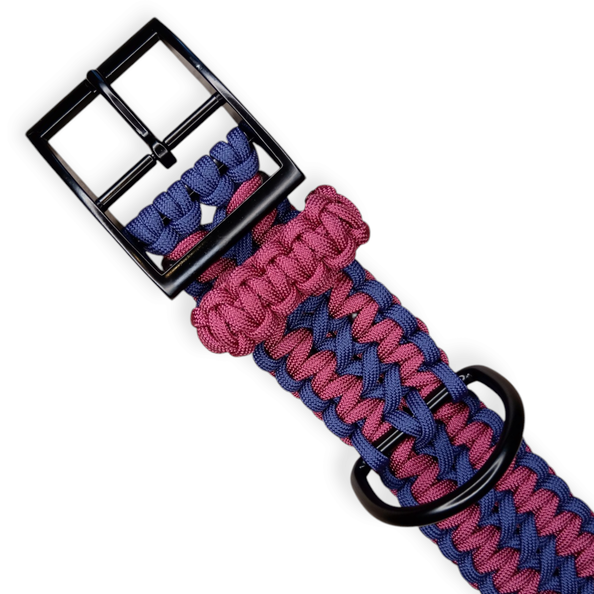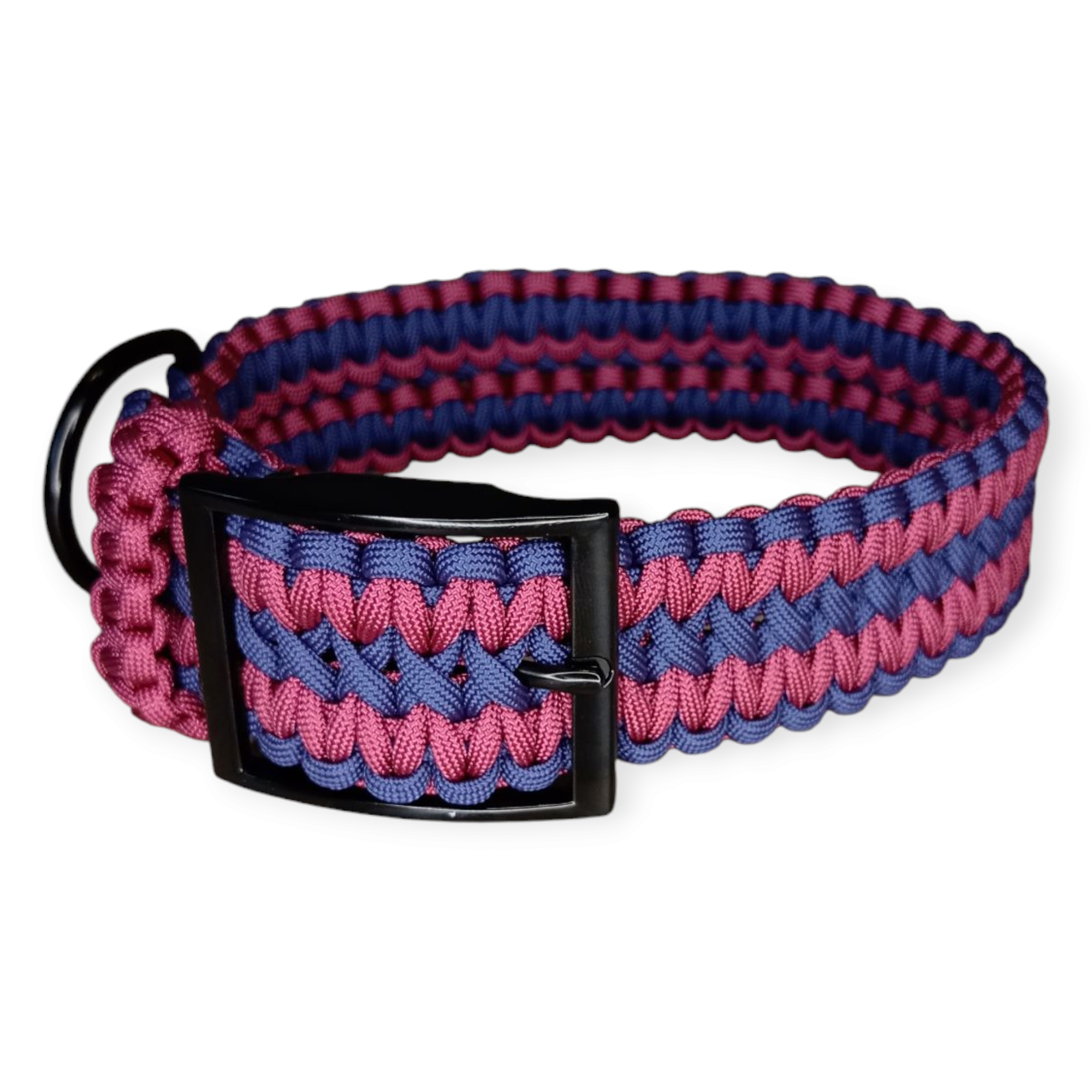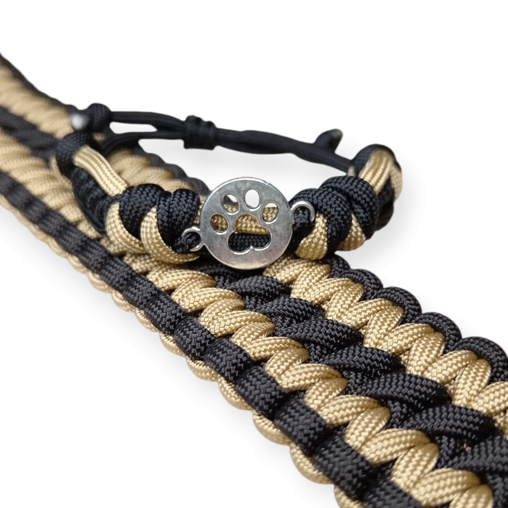Obojek pletený z Paracordu o šířce 40 mm je dílem, které kombinuje estetiku a funkčnost. Každý kus je ručně vyroben, což zaručuje jeho jedinečnost a přidává na hodnotě. Tento typ obojku je vyroben z paracordu, což je materiál známý svou výjimečnou odolností vůči extrémním podmínkám. Díky tomu je tento obojek ideálním doplňkem pro ty, kteří se chtějí odlišit a zároveň kladou důraz na kvalitu a trvanlivost. Obojek je navržen s ohledem na praktické využití – jeho nastavitelnost umožňuje snadnou úpravu velikosti pro pohodlné nošení na krku vašeho psa. Připevnění obojku je jednoduché díky pleteným okům uprostřed, které zajišťují nejen pevnost, ale také snadnou manipulaci.