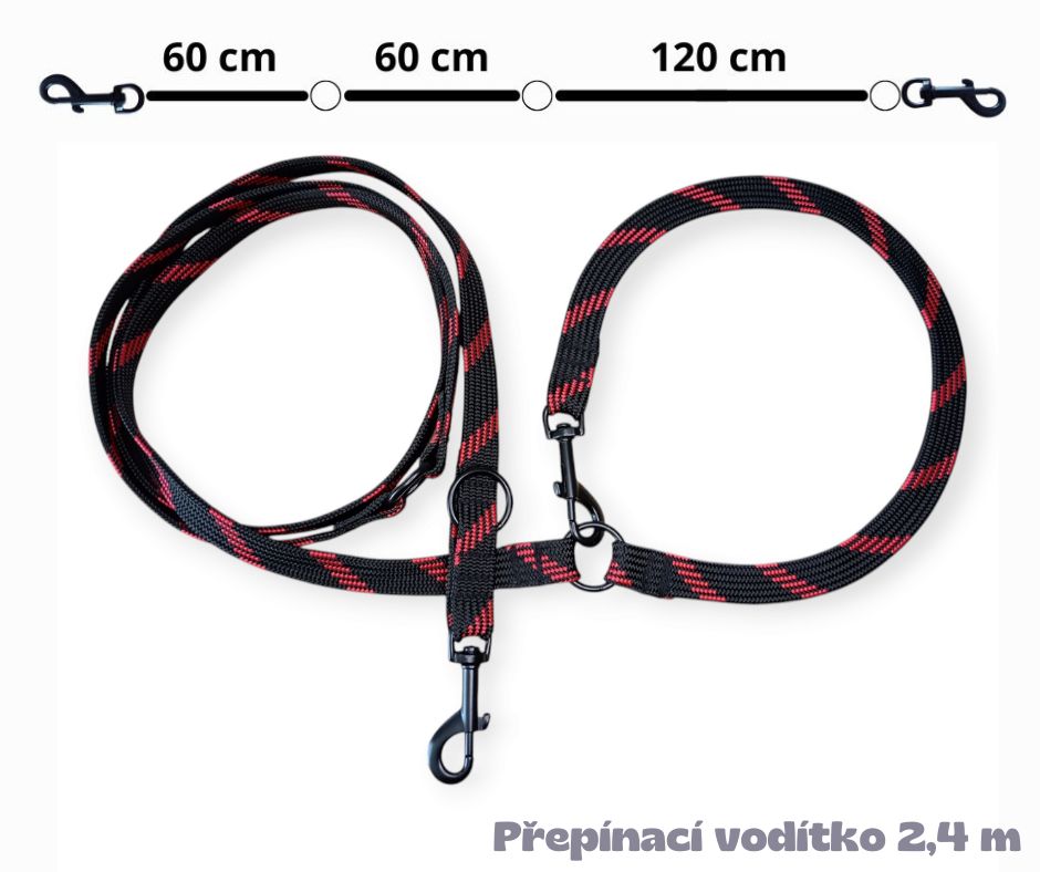 Přepínací vodítko v šířce 20 mm a délce 240 cm. Umožňuje snadné nastavení délky díky třem kroužkům pro přepínání, což poskytuje pohodlí při manipulaci. Vodítko lze snadno zkrátit na polovinu nebo dokonce hodit přes rameno, čímž máte volné ruce pro jiné aktivity.