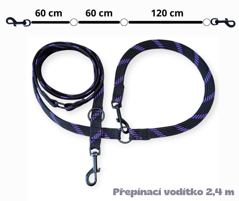 Přepínací vodítko v šířce 20 mm a délce 240 cm. Umožňuje snadné nastavení délky díky třem kroužkům pro přepínání, což poskytuje pohodlí při manipulaci. Vodítko lze snadno zkrátit na polovinu nebo dokonce hodit přes rameno, čímž máte volné ruce pro jiné aktivity.
